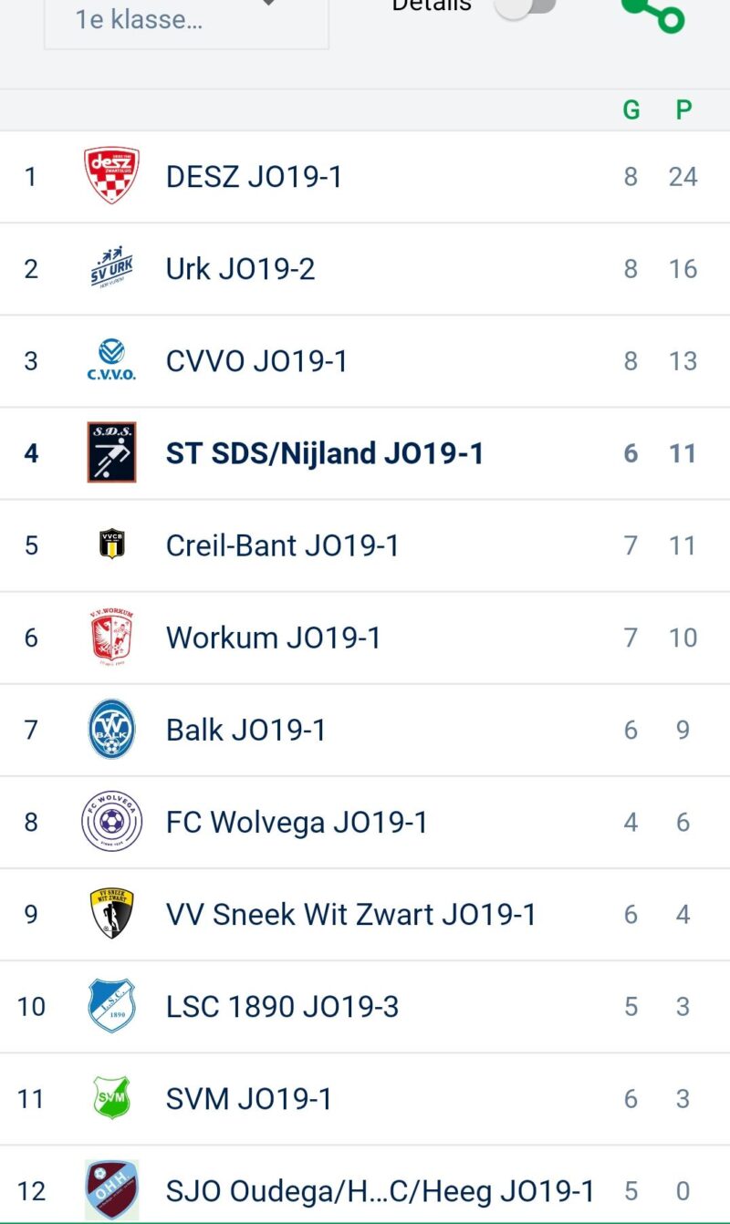 16 april 2026Een mooie 2-1 overwinning op Urk JO19-2 gisteravond. Een van de betere tegenstanders die makkelijker voetballen, maar op het hobbelveld in Nijland lastig uit de voeten konden. Verdedigend goed over de hele wedstrijd, tegen een ploeg die al 29 doelpunten in 7 wedstrijden had gemaakt, maar SDS Nijland maar 5 tegen in 5 wedstrijden. 1e helft weinig kansen, veel strijd wel 1-0 voor. Meteen na rust een slippertje van Daniel en de 1-1. Uiteindelijk de beste kansen in de 2e helft en uiteindelijk werd Pieter gevloerd in de 16 in de 85e minuut. De scheidsrechter wees naar de stip en de aanvoerder nam zijn verandwoordelijkheid en schoot koelbloedig de bal hard rechts terwijl de keeper de linkerhoek koos. Uiteindelijk vrij makkelijk overeind gebleven en mooie punten, waardoor we naar plek 4 in de ranglijst schuiven met een aantal wedstrijden minder. Zaterdag thuis in Easterein tegen Wolvega JO19-1.