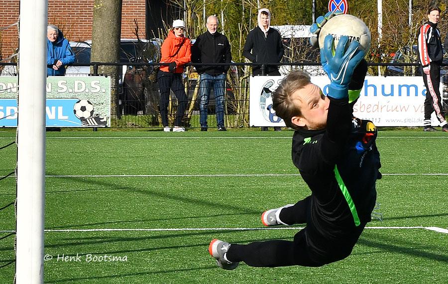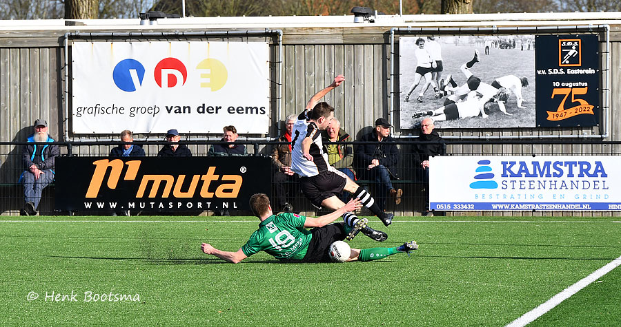 Tegen topteams als Heerenveense Boys (HvB) heb je vooraf een kleine kans op een goed resultaat, maar na zeven minuten werd die kans nog wat kleiner. Na een verkeerde terugspeelbal kon Sander van der Werff ongestoord de 0-1 binnen schuiven en hier schoot SDS zichzelf nadrukkelijk in de voet. Beide teams voetbalden niet goed en kansen waren hierna niet meer te noteren, maar kort voor de thee viel toch de 0-2. Tiemen Pen had al eerder gedemonstreerd dat hij goed vrije trappen kon nemen en deze keer krulde hij de bal van achttien meter strak over de muur in de bovenhoek. SDS was hierna nog dicht bij de aansluitingstreffer, maar Gerwin Sybesma kopte een vrije trap van Wiebe Heeres via de bovenkant van de lat over.