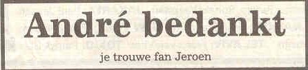 Sneon lêzen wy in opmerklike rouwadvertinsje yn ‘e Telegraaf. Wy hawwe noait witten dat Jeroen Brouwer sa gek wie fan de musyk fan André Hazes. Of soe it wêze om ’t de Jimbar no in grutte klant kwyt is??