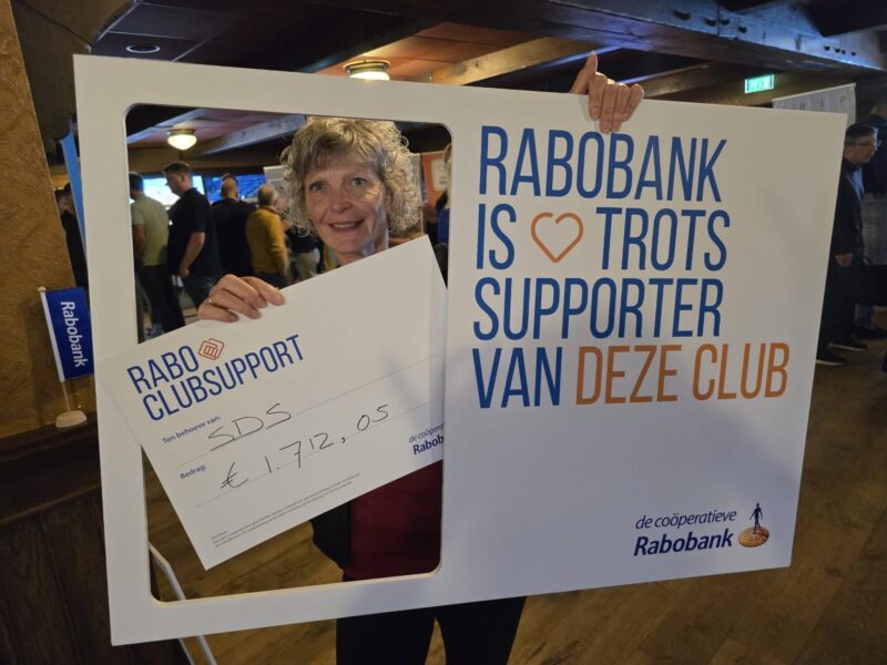 Foarsitter fan vv SDS, Helga Develing, mocht juster in alderaardichste sjek yn ûntfangst nimme fan Rabobank Sneek-Súdwest-Fryslân. Allegear tige by tige foar it stimmen en de Rabobank fansels.