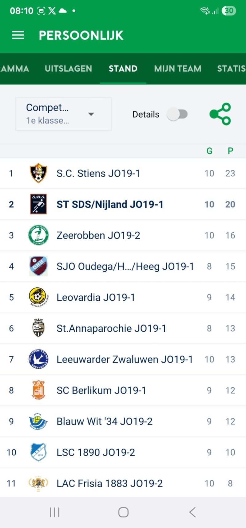 sc Stiens hat 23 punten en in hiel goed doelsaldo en SDS/Nijland hat 20 punten en in “iets” minder doelsaldo.