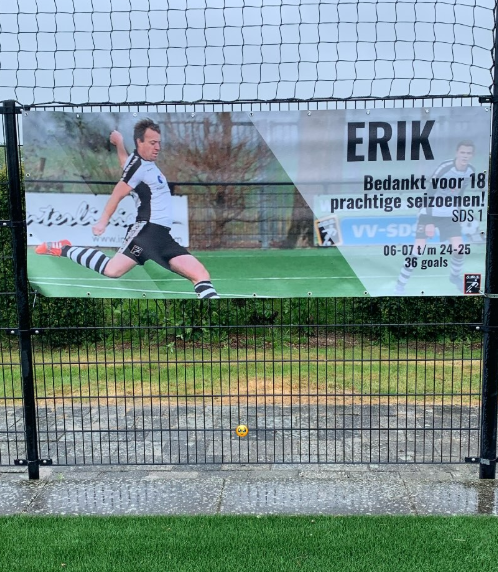 Erik Haitsma naam sneon ôfskie by SDS 1 mei in prachtich spandoek fan him fan SDS 1.