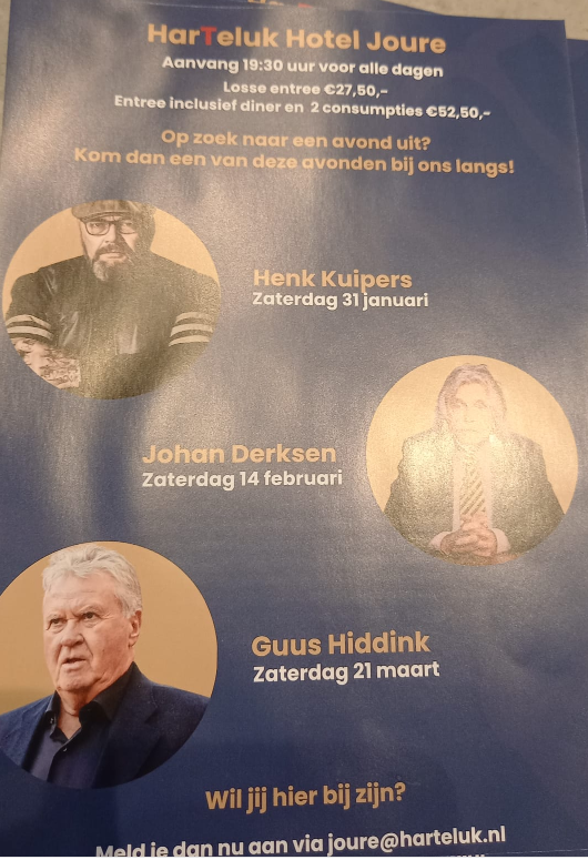 Johan Derksen komt op sneon 14 febrewaris yn Harteluk Hotel Joure.