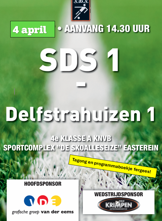 SDS 1 – Delfstrahuizen 1 (14.30) Om 14.30 begjint it restant fan de wedstriid SDS 1 – Delfstrahuizen 1. It is in wedstriid dy’t bepaalt wa’t nei 60 minuten fuotbal de koprinner is fan de 4de klasse A. Seleksje: Mark […]